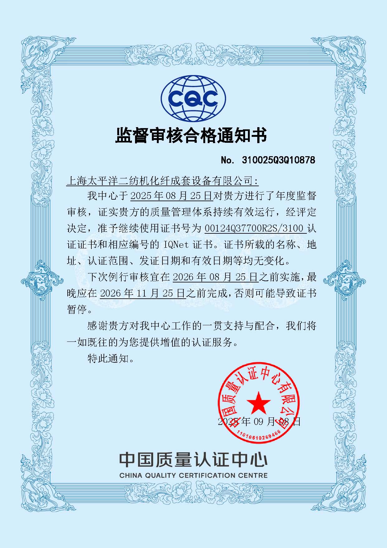 监督审核合格通知书